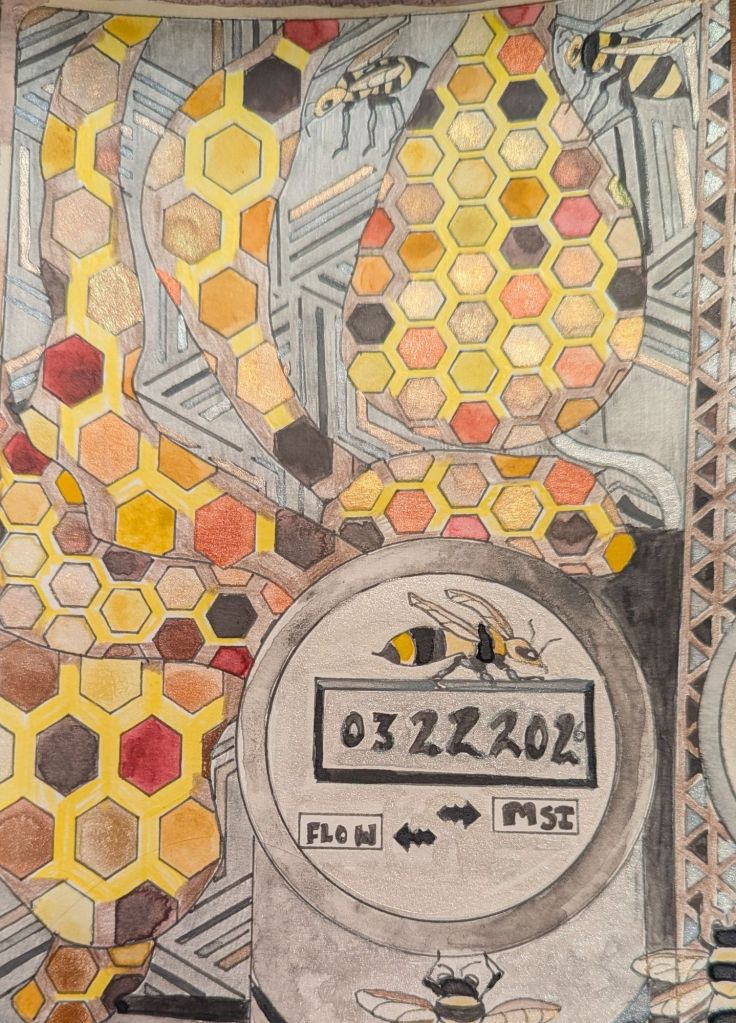 Nature#32- Bees in Water Meter 2026 Watercolors, pen, and Colored Pencils Share this: Share on Facebook (Opens in new window) Facebook Share on X (Opens in new window) X Like Loading... Related March 22, 2026 by hilldowdy1 Leave a comment
